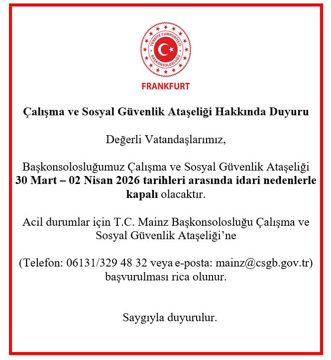 Başkonsolosluğumuz Çalışma ve Sosyal Güvenlik Ataşeliği 30 Mart – 02 Nisan 2026 tarihleri arasında idari nedenlerle kapalı olacaktır.